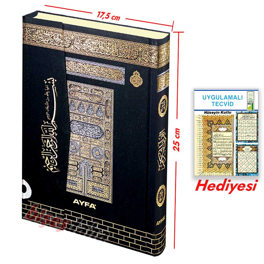Kabe Desenli Orta Boy Kuran, Hafız Osman Hattı esas alınarak Ayfa Yayınları tarafından yayınlanan; Bilgisayar Hatlı, Mühürlü ve Diyanet onaylı, 616 Sayfa, Şamua Kağıt, Lüx Suni Deri Ciltli, 17,5x25 cm Kabe Motifli Orta Boy Kur'an-ı Kerimdir.